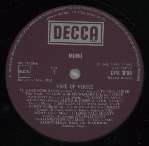 VARIOUS Hard Up Heroes (1974 UK 24-track Mono double compilation LP, including hard to find sixties recordings by those who would go on to bigger things, including Eric Clapton, David Bowie, Rod Stewart, Alexis Korner, John Mayall & Van Morrison as well as some killer freakbeat type gems from The Poets, Timebox, The Birds & more, front laminated gatefold picture sleeve. The sleeve shows just a little light shelfwear & the vinyl looks barely played DPA3009/10)