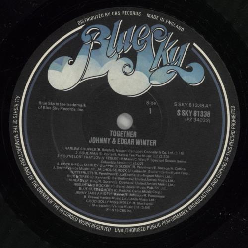 JOHNNY & EDGAR WINTER Together (1976 UK 7-track LP, recorded live at the Swing Auditorium, San Diego Sports Arena. Picture sleeve with illustrated lyric inner, the picture sleeve shows a little corner creasing with foxing/discolouration to theinner & scuffing and the vinyl is Excellent with few signs of play SKY81338)