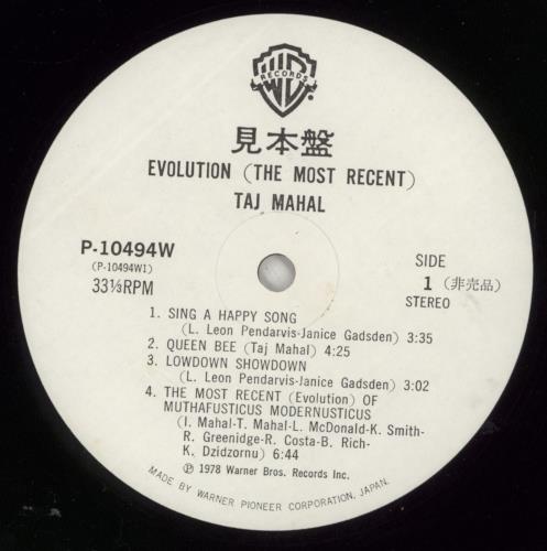 TAJ MAHAL Evolution (The Most Recent) (1978 Japanese 9-track sample LP with custom promotional white Warners labels, picture sleeve complete with Japanese/lyric insert & obi-strip. The sleeve shows minimal wear and the vinyl is Near Mint P-10494W)