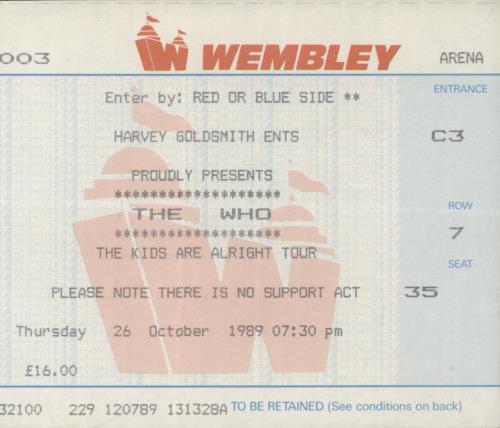 THE WHO The Kids Are Alright Tour 1964-1989 (1989 UK 48-page 12" x 10" tour programme issued during the tour celebrating their 25th anniversary, featuring a wide selection of media articles and many photographs spanning their 25 year career -the cover shows only light signs of storage wear and the inner pages are in excellent condition. This copy comes with a ticket stub for the 26th October show at Wembley Arena)