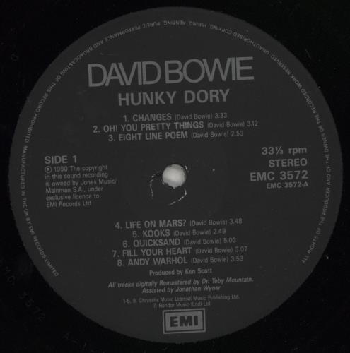 DAVID BOWIE Hunky Dory (1990 UK EMI 15-track digitally remastered LP, including four bonus tracks not on the original album - Bombers, The Superman [Alternate Version], Quicksand [Demo Version] & The Bewlay Brother [Alternate Mix], barcoded gatefold picture sleeve. The sleeve has a little minor corner creasing/scuffing but is otherwise in Excellent condition & the vinyl looks barely played, priced advantageously EMC3572)#Top 500 Greatest Albums Of All Time