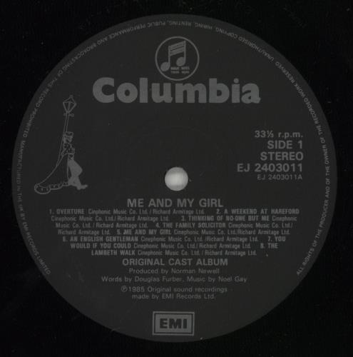 ORIGINAL CAST RECORDING Me And My Girl (Autographed 1985 UK 16-track vinyl LP, the Lambeth Walk musical featuring Robert Lindsay, Emma Thompson, Frank Thornton and others, picture sleeve with lyric inner. This copy has been autograped on the reverse by Robert Lindsay in blue ballpoint pen. This copy also includes a programme for the for the show at the Adelphi Theatre)