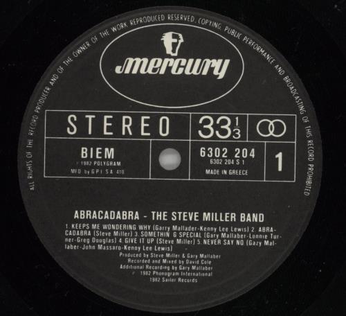 STEVE MILLER BAND Abracadabra (1982 Greek 10-track vinyl LP, including the huge radio hit title cut, picture sleeve with lyric inner. The sleeve displays some typical edgewear and the odd scuff mark and the inner shows some seam splitting. Thevinyl is Excellent with the odd cosmetic hairline but only light signs of play)