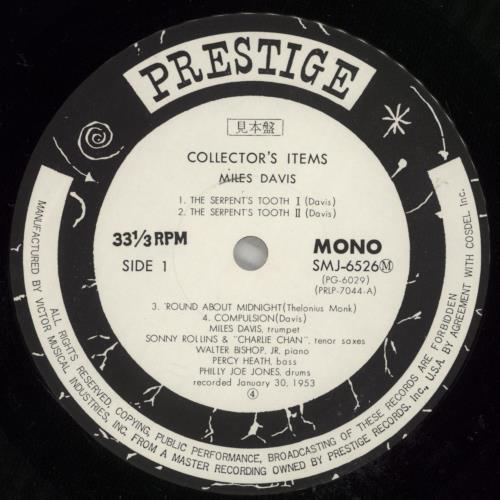 MILES DAVIS Collectors' Items (1976 Japanese sample issue of the 7-track LP from 1956 with custom promotional white Prestige labels, also featuring Sonny Rollins & Charlie Parker (as 'Charlie Chan') in sessions recorded in 1953 & 1956, picturesleeve with Japanese insert & 'Prestige Jazz Masterpiece Series' obi-strip. The sleeve shows a little foxing and the vinyl is Near Mint SMJ-6526(M))