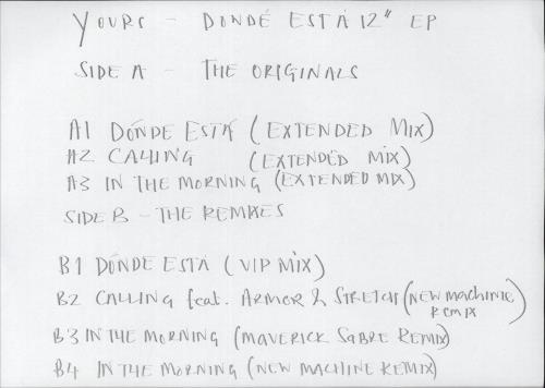 YOURS Dónde Está EP (2023 UK 7-track 12" vinyl EP stamped white labels. The debut EP from London based house collective, consisting of extended mixes and remixes. Plain die-cut sleeve with tracklisting insert. The vinyl is Excellent with little sign of play)