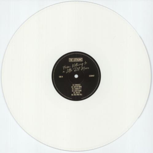 THE LATHUMS From Nothing To A Little Bit More (2023 UK limited edition 11-track LP pressed on 140-gram White Vinyl, including the singles Sad Face Baby, Say My Name and Struggle. Picture sleeve with lyric inner. The sleeve remains in the open shrink with hype-sticker and is free of shelfwear. The inner has the start of a small split to the bottom seam and the vinyl is in Near Mint condition. This copy includes a fully Autographed custom beer mat, signed in silver and black marker pen by the band)