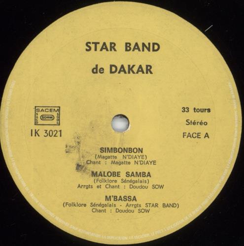 STAR BAND DE DAKAR Star Band Of Dakar (Rare 1975 French 6-track vinyl LP with yellow labels, front laminated picture sleeve. One of the pioneering bands in African/Senaglese music, formed in 1960 with many musicians passing through the ranks [Amara Toure, Youssou N'Dour]. Although not credited on the sleeve this album is often referred to as Volume 2 [twelve volumes in total], it's a wonderful listen and is noted for its mix of Cuban rhythms with Senegalese mbalax guitars and sabardrums. The sleeve is Excellent [a few spots of discolouration the reverse], the vinyl has a few faint hairlines not affecting play and also grades Excellent IK3021)