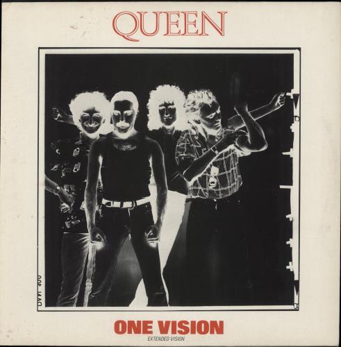 QUEEN One Vision (1985 UK 12" single, taken from the number one UK album 'A Kind Of Magic', featuring the Extended Version of the title track & Blurred Vision, complete with red lyric inner in a 'negative photo' style picture sleeve. The sleeve displays light wear/foxing and the vinyl remains Excellent with just a few signs of play 12QUEEN6)