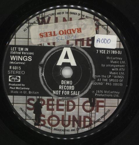 WINGS Let 'Em In (Rare 1976 UK 'A' label demonstration vinyl 7" for the single release, with custom 'Not For Sale' print on the four-prong centre. Features the Edit version on the A-side & the non-Edit version on the B-side. Housed in a plain black die-cut sleeve, this is an ex-radio library copy with two catalogue stickers on the A-side label. The vinyl is clean & grades Very Good with several paper hairlines either side not upsetting play R6015)
