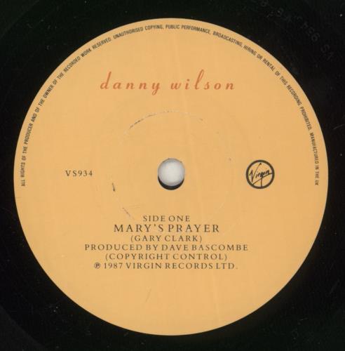 DANNY WILSON Mary's Prayer (1988 UK solid centre 7" vinyl single with the yellow paper labels, also including Monkey's Shiny Day. The paper picture sleeve has a small tear to the opening edge while the vinyl remains in excellent condition)