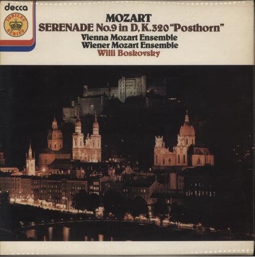 VIENNA MOZART ENSEMBLE conducted by WILLI BOSKOVSKY Serenade No. 9 in D, K.320 "Posthorn" (1978 UK Stereo factory sample LP issue of the 1973 performance featuring Adolf Holler [Posthorn] with custom pink 'not for sale' labels, front laminatedpicture sleeve with sleeve notes in English, French & German. The sleeve shows light wear and the vinyl appears barely played JB34)