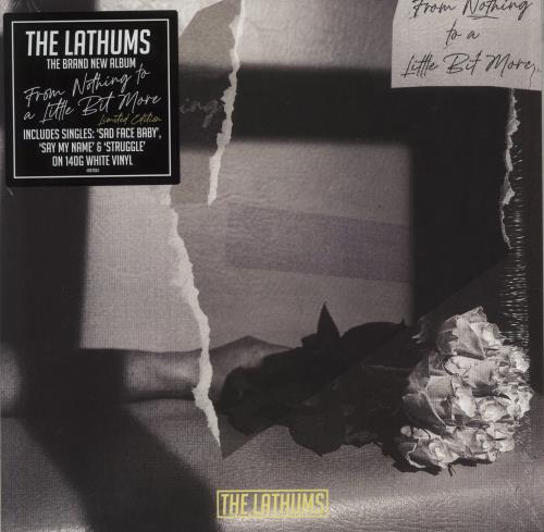 THE LATHUMS From Nothing To A Little Bit More (2023 UK limited edition 11-track LP pressed on 140-gram White Vinyl, including the singles Sad Face Baby, Say My Name and Struggle. Picture sleeve with lyric inner. The sleeve remains in the open shrink with hype-sticker and is free of shelfwear. The inner has the start of a small split to the bottom seam and the vinyl is in Near Mint condition. This copy includes a fully Autographed custom beer mat, signed in silver and black marker pen by the band)