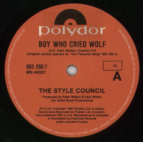 THE STYLE COUNCIL Boy Who Cried Wolf (1985 Australian 7" vinyl single, also including [When You] Call Me, plain die-cut paper sleeve. The vinyl appears in near as new condition)