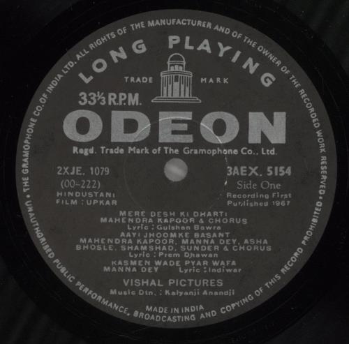 ORIGINAL SOUNDTRACK Upkar (1970s Indian issue of the 1967 7-track vinyl LP on the black Odeon label, Kalyanji-Anandji's movie score featuring performances by Mukesh, Lata Mangeshkar, Asha Bhosle And Mohd. Rafi, pasted picture sleeve. The sleeve shows light wear and the vinyl is Near Mint 3AEX5154)